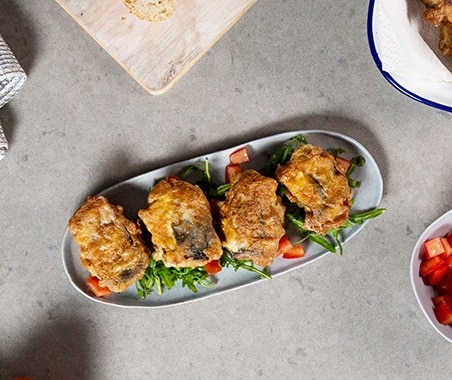• Dip each mackerel fillet first into the egg wash, coating evenly on every side